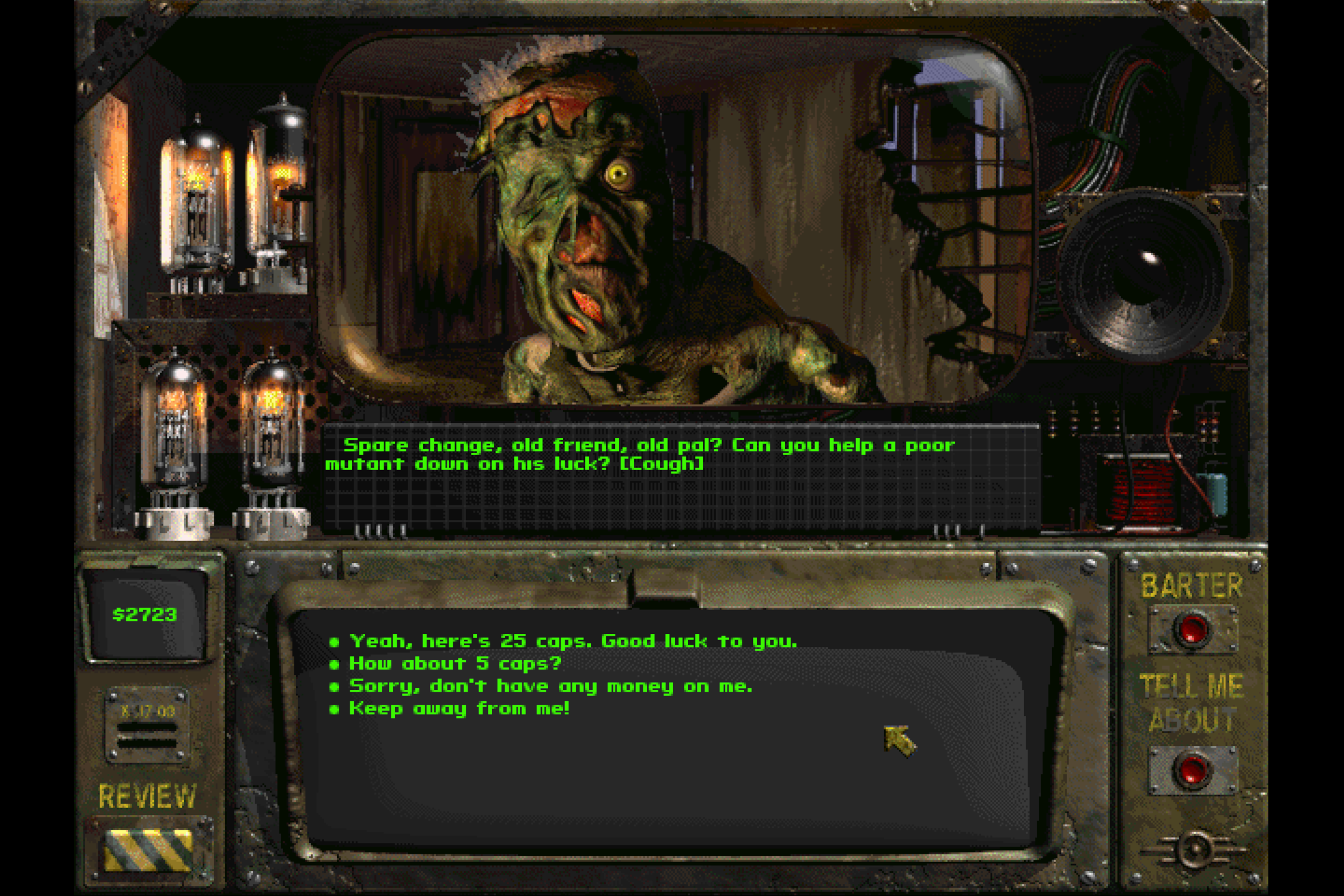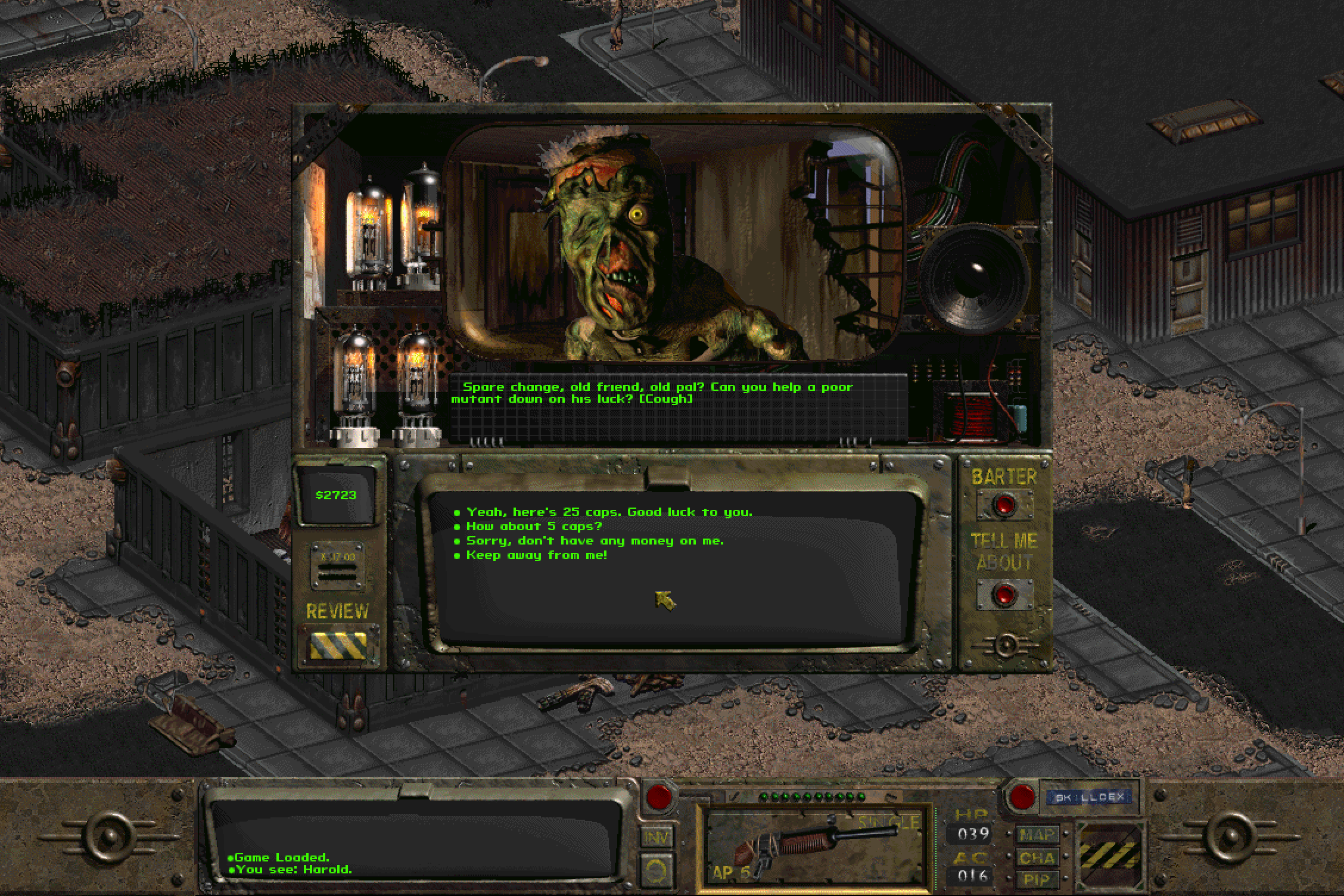 At its core Fallout 1 is an immersive RPG with lots of very rich dialogue (including choices that actually have consequences!), and turn-based combat. The game takes place in southern California, near the ruins of Los Angeles. You can travel solo or with companions, and one infamous mechanic of the game involves time limits for certain objectives. 2